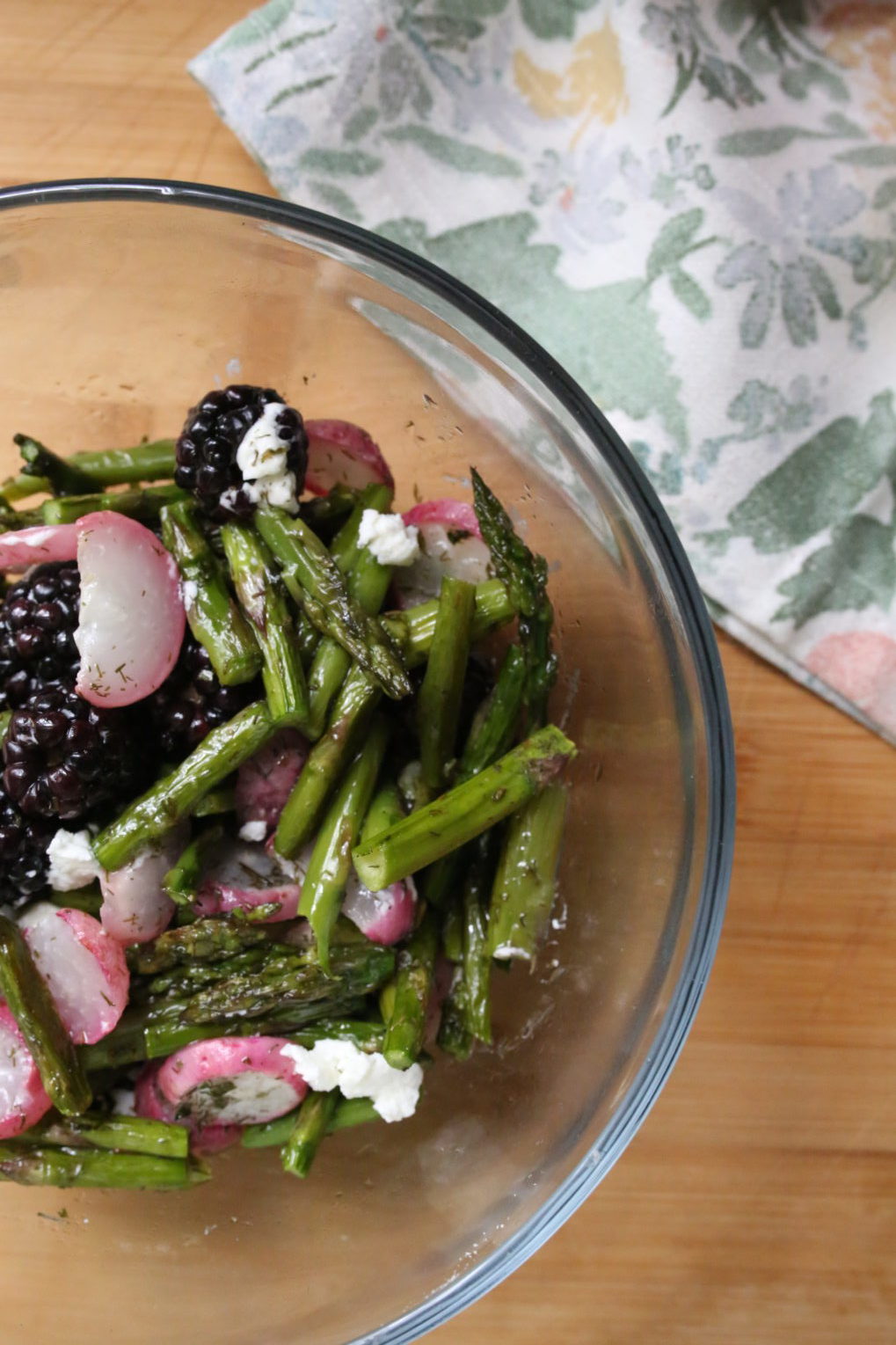 3 Toss the asparagus, radishes and blackberries together in a medium sized salad bowl.