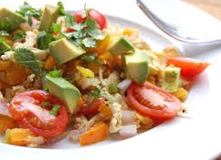 4. Top eggs and vegies with remaining tomatoes, avocado and plenty of cilantro. Add a squeeze of orange over the top.